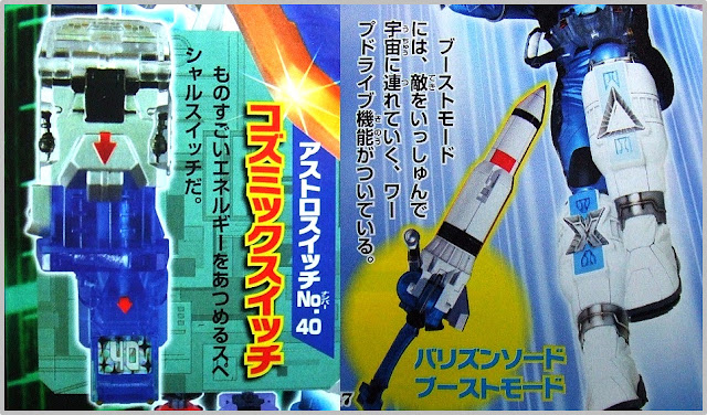 Kamen Rider Fourze Cosmic States pode ser ativado através do uso do Astro Switch No.40 Cosmic (à esquerda). Sua arma principal é a Barizun Sword Boost Mode (à direita). Ela é tão forte que pode mandar o inimigo voando para o espaço!